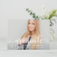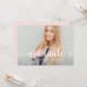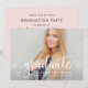 Na moda e placa de anúncio de graduação elegante e convite de festas apresentam uma foto de mais velho com uma cobertura de script de "formando". Personalize o texto personalizado moderno com seu nome de formando, escola e ano de aula. Esta design de placa dupla lateral inclui o texto do convite de festa de formatura na parte traseira. O esquema bonito de cor rosa e cinza escura / preto suave pode ser personalizado para coordenar com cores de foto ou de festa.