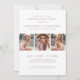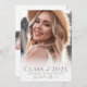 Um anúncio de graduação simples e elegante, inspirado no bô, com uma estética leve e brilhante. A frente apresenta uma foto de página de cheio com um gradiente branco suave na parte inferior, formando o texto de forma elegante. "Classe de 2025" aparece em fontes clássicas bege ou taupe, seguidas pelo nome do formando e pela escola em elegante roteiro manuscrito para um toque de eterno. A parte traseira se transforma em um convite para a festa de formatura, apresentando três pontos de fotos centralizados para mostrar momentos especiais do formando. Abaixo das fotos, os detalhes do convite são exibidos em uma fonte de serif bege refinada, fornecendo espaço para as informações de data da festa, hora, local e RSVP. O design mantém um fundo branco coeso e um esquema de cor bege para um aspecto quente e sofisticado. Totalmente personalizável, você pode editar o texto, as fontes e as cores para corresponder ao seu estilo pessoal ou às cores da escola.