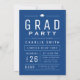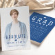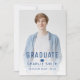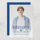 Anúncios de graduação em tipografia modernos e mínimos com fotos, festa de formatura divertida convidada no verso em azul e branco, Personalize-o com sua própria foto e informações de festas.