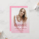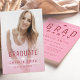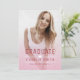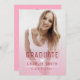 Anúncios de graduação em tipografia modernos e mínimos com fotos, festa de formatura divertida convidada no verso em rosa, vermelho e branco, Personalize-o com sua própria foto e informações de festas.