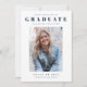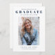 Um anúncio de graduação de fotos simples e limpo com detalhes de convite no verso. Este design apresenta um grande tipo de formando e nome de estudante acima de uma foto retrato do formando.