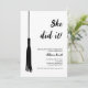 Celebre um marco importante com o nosso convite moderno e na moda! Apresentando um elegante design preto-e-branco, este convite ostenta um texto "Ela Fez!" e uma fita-formando, fazer a forma perfeita de comemorar o trabalho e a dedicação do duro. Adicione um toque pessoal carregando uma foto do formando e personalize o texto para ajustado dos detalhes do evento. Seja um segundo grau, uma faculdade ou uma graduação na escola formando, este convite certamente impressionará. Peça o seu hoje e prepare-se para a festa!