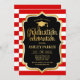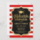 Convite festa de formatura para homens ou mulheres. Cartão de convite elegante em vermelho, preto e ouro. Design moderno simples com faixas, boné, dourado falso e letra de script de tipografia. Perfeito para uma comemoração de na moda.