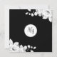 Fundo preto chico e moderno, decorado com delicado, e arranjo floral branco do estilo de esboço moderno no canto superior direito e canto inferior esquerdo. Combinação de fontes chic de caligrafia elegante e tipografia branca serif para os detalhes do convite de festa de formatura. O verso do convite apresenta os mesmos arranjos florais com um elegante carvão preto e um monograma do tipo medalhão branco.