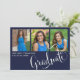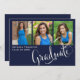 Este design apresenta uma fotografia de formando de graduação de formando, com uma grelha de imagens de colagem multifotografia, e uma página de código QR no Facebook URL, uma elegante imagem de arco moderna minimalista, uma letra de escrita de na moda caligrafia de tendência, com cores de escola qualquer estilo azul, para segundo grau ou mais velho universitário, um design de tipografia elegante, com escrita de caligrafia criativa de rico, um formando de convite de festas cartão de de de graduação
