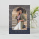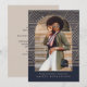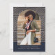 Este moderno anúncio de graduação azul e natural do marinho apresenta uma foto em uma bela forma de arco, e um padrão geométrico listrado pela tendência.