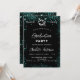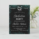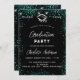 Um convite moderno e elegante para a festa de formatura. Um fundo preto decorado com brilho verde, faíscas em tons, faíscas. Personalize e adicione um nome, ano e detalhes.