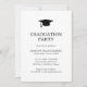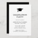 Convite de festa de formatura preto e branco clássico com um design simples e minimalista com um boné de formando no topo. O dorso é preto sólido. Um convite tradicional com um toque masculino para um formando de menino.