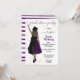 Convites de graduação moderna para o novo formando da sua família. Apresenta a parte de trás de uma feliz e castanha cabeleira, cabeleira, afro-americana, com um vestido preto de graduação jogado no ombro, um vestido roxo de ameixa, boné, com um confete dourado falso com um roxo moderno e branco riscado para trás. Mude o cabelo para o ajustado das suas necessidades, por favor peça-me a sua cor de cabelo em tkatz@me.com. Excelente para segundo grau, enfermeiro, doutor, faculdade, faculdade de direito, formando etc.