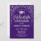 Convite festa de formatura para homens ou mulheres. Cartão de convite elegante em roxo e prata. Design moderno simples com faux glitter confetti, uma fonte de script de boné e tipografia. Perfeito para uma comemoração de na moda.