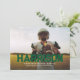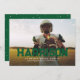 Apresentando um nome verde ousado em uma foto de solteiro, este anúncio de graduação é perfeito para um atleta graduado. Com uma fonte do estilo letterman, seu design pode ser personalizado com todos os detalhes do formando na frente. A parte de trás verde inclui espaço para duas fotos adicionais, assim como texto que pode ser usado para detalhes de convites para festas de formatura, planos futuros ou qualquer outra coisa que você queira. Com seu estilo esportivo, esse anúncio de graduação e convite é excelente para caras e meninas e trabalha com uma variedade de fotos.