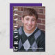 This design features a graduation graduate grad laureate, a purple photo picture senior, a classic traditional laurel leaves symbol, a graduation cap mortar board hat, a simple minimalist minimal mortarboard, a school color custom name, with the class of calligraphy typography, a classy graduation announcement, grad graduation party invitations, a purple graduation photo cards
