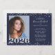 Celebrate an unforgettable milestone with this elegant graduation party invitation featuring an editable navy blue background accented with a faux silver glitter 2026 and silver confetti for a modern classic look. The layout highlights a large graduate photo on the left with the Class of 2026 displayed boldly and the event details on the right including the graduate’s name and school. CHANGES: Change the background color to your school color, party color or favorite color in EDIT. Ideal for high school or college celebrations, this invitation is a polished way to invite family and friends to celebrate your graduate in style.