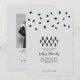 The front features a festive scatter of graduation cap confetti paired with bold, modern typography announcing the party details. On the back, a photo of the graduate is showcased along with space to include their name, school, degree, and class year.