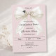Celebrate your achievement with this elegant ivory bow graduation invitation. The design features a large, sophisticated satin ribbon adorned with delicate pearl strings and a subtle mortarboard icon. Dusty, blush pink background. It is the perfect choice for high school or college seniors looking for a feminine and chic announcement.