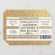 Efeito de falso brilho, convite Dourado ao estilo de ingresso colorido como uma admissão ao cinema ou ao cinema. O convite exclusivo de canto 50 com estilo de tíquete é personalizável para o seu evento ou ocasião. Use-o para uma festa de aniversário 50ª ou qualquer evento. Visão de fundo da brilha do ouro com divisões brancas e seções, com um texto de estilo de impressão do computador.