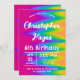 Lance uma celebração colorida com este convite de festa de aniversário vibrante tie-dye de arco-íris! O fundo psicodélico define um clima divertido e enérgico, perfeito para qualquer idade. Personalize facilmente com o nome da criança, idade e detalhes da festa para um evento memorável e brilhante.