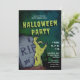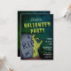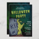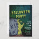 Este convite do Halloween moderno mostra a mão verde de zumbis a sair de uma sepultura em um cemitério assustador. A tipografia é divertida, mas assustadora. Este é o convite perfeito para uma festa divertida de Halloween!