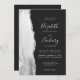 The left-hand edge of this elegant modern wedding invitation features a gray and white watercolor agate border trimmed with faux silver glitter. The customizable text combines handwriting, copperplate and italic fonts silver gray on a slate black background. The reverse side provides space for wedding details on a solid slate background, along with a QR code guests can scan to visit your website and RSVP, which saves the cost of printing and mailing separate RSVP cards.