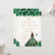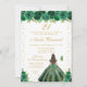 This elegant and glamorous birthday party invitation features a beautiful princess with brunette hair and fair skin in a green ball gown. The text combines handwritten script and modern sans serif fonts for a classy and sophisticated look. The floral arrangements, butterflies and gold confetti create the perfect blend of rustic and chic.