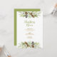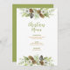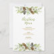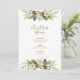 Foca de Natal verde com rosas brancas, pinecones e cardápio de Natal moderno e verde. Tipografia moderna em verde e castanho claro — menu de Natal minimalista.