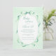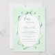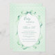 Beautiful green watercolor ribbon frame surrounding lovely fonts and scripts done in coordinating colors baby shower invite. A green and white sweet coordinated polka dot background. A perfect baby shower invitation for any season.