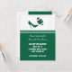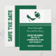Fun football wedding Save the Date announcement done in hunters green and white. Graphics of a elegant green stiletto high heel kicking a green and white football decorates the top white portion of the card. The lower part of the card is done in green, with custom white text ready to personalize with your wedding information. A green and white back has green text running sideways reading Save The Date. Great Save The Date announcements for the football fan couple.