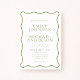 This wedding invitation features a clean white background with a soft green wavy outline and matching green typography. The thin wavy border adds an elegant, organic touch while keeping the overall design minimal and refined. The green and white color palette creates a fresh, natural look that is perfect for garden and outdoor weddings.