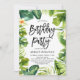 Convide familiares e amigos para o seu evento com este convite de aniversário tropical. Apresenta a ilustração aquosa de monstera, palmeiras, bananeiras e outras culturas tropicais com plumeria amarela. Personalize adicionando nome, data, hora, endereço e outros detalhes do evento. Você pode personalizar ainda mais esse convite mudando o padrão tropical para uma foto ou qualquer outra imagem. Este convite é excelente para aniversários de verão e luaus.