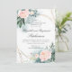 Aquarela verde, moldura geométrica dourada e peônias rosa beije convites para festa de aniversário de casamento