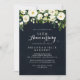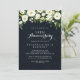 Este convite de aniversário de 50 anos de casamento greenery floral branco é perfeito para um evento rústico. O design apresenta elegantes peônias brancas aquareladas com folhagem verde em um fundo azul escuro. Altere o número para celebrar qualquer marco de aniversário de casamento.