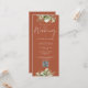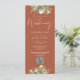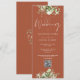 Um convite de casamento floral verde com tipografia elegante de escrita de caligrafia e o seu website de casamento Código QR num fundo de terracota. Projetado por Thisnotme©