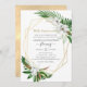 Folhas tropicais verde e branco em aquarela e magnólias brancas convite de aniversário de casamento de 50 anos com moldura geométrica dourada e tipografia elegante.