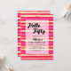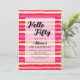 Este convite de 50 anos colorido e divertido apresenta um padrão sem costura de listras angustiado contendo cores rosa, vermelha, laranja e pêssego.