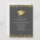 This modern design features a graduation hat and confetti in gold on a background of grey with white text.