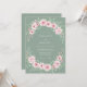 Este design apresenta uma delicada grinalda de flores cor-de-rosa suaves e folhagens sobre um fundo suave de salvia. O arranjo evoca uma atmosfera suave e romântica com um toque de elegância natural. Sombreamento sutil e texturas variadas de pétalas adicionam profundidade à composição floral.