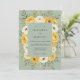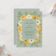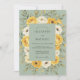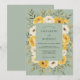 Um arranjo delicado de flores amarelas douradas e brancas cremosas circunda um painel verde fosco. Este design evoca um clima suave e romântico com seus elementos florais pictóricos e paleta de cores naturais.
