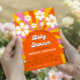 Surpreenda seus hóspedes com este belo e groovy convite com sol colorido, margarida retrô e texto personalizado. Adicione facilmente o texto desejado clicando na opção "personalizar este modelo".