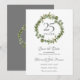 Com uma elegante guirlanda de folhagem florestal, este cartão de save-the-date de aniversário de casamento de 25 anos pode ser personalizado com suas informações especiais de aniversário de prata. O verso apresenta uma guirlanda de folhagem floral correspondente emoldurando as datas do seu aniversário em texto branco elegante em um fundo prateado. Projetado por Thisisnotme©