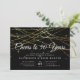 Nossos convites elegantes de festa de aniversário de casamento em preto, dourado e branco chiques apresentam um fundo preto rico com cordas de luzes de folha dourada falsa na parte superior e "Brindes a XX anos" em tipografia de caligrafia elegante. Personalize para qualquer aniversário de casamento; exemplo mostrado para um aniversário de 50 anos. Personalize com os detalhes da celebração do seu aniversário de casamento abaixo em letras brancas.