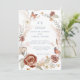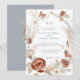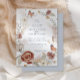 O design de convite de casamento de flores silvestres BOHO fresco e moderno foi pintado à mão em aquarela pela artista e designer licenciada internacionalmente, Audrey Jeanne Roberts. Flores silvestres secas e desbotadas de cor quente são organizadas em uma coroa oval solta com arte linear e um par de borboletas delicadas, grama-dos-pampas e folhagens de ginkgo. Esta versão tem uma frente branca leve e arejada com texto em azul ardósia empoeirado e fundo no verso. Direitos autorais.