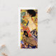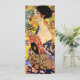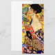 Cartão com pintura de óleo de Gustav Klimt Lady com ventilador (1918). Uma mulher vestindo um quimono azul segura um fã vermelho contra um fundo amarelo colorido de flores e pavões. Um presente de excelente para fãs de arte japonesa e europeia.