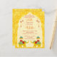 Modelo de convite de haldi amarelo orçamento para elefantes de casamento indianos divertidos, fundo com padrão amarelo, elefantes de casamento fofos, para convite de haldi.