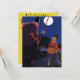 Ilustração vintage de design de feriado de Halloween apresentando uma bruxa assustadora segurando um cabo de vassoura. Ela está assustando uma pequena criança segurando uma abóbora jack-o-lantern assustadora. Uma lua cheia está no céu noturno na véspera de todos os santos.