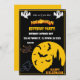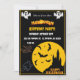 Invitacion 5x7 con disenos de unas brijitas listas para ir a la fiesta al Castillo embrujado en Luna llena listas para divertirse, colores naranja , negro y un Poco de Blanco.