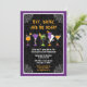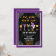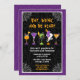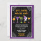This fun and spooky invitation features Halloween themed cocktails with decorations such as a witch's hat, broomstick and cauldron, ghost, bat, pumpkins and eyeballs. In the background is a black and purple damask pattern with spider webs. The text combines decorative and serif fonts for a stylish and modern look. This is perfect for a Halloween fancy dress costume party.
