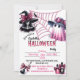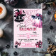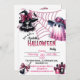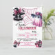 Este convite divertido e chique para o Dia das Bruxas apresenta uma combinação na moda de rosa e preto, perfeita para adicionar uma reviravolta moderna às suas celebrações assustadoras. A design inclui elementos caprichosos como um fantasma e esqueleto enfeitiçado com arcos cor-de-rosa, colocados contra um pano de fundo de uma delicada teia de aranha. A tipografia é uma mistura de fontes góticas e lúdicas, fazer o convite divertido e fácil de ler. Com detalhes claros sobre a data, hora e local do evento, este convite é ideal para aqueles que buscam hospedar uma elegante e sombria reunião do Dia das Bruxas.