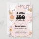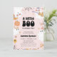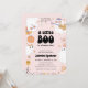 Este convite de chá de bebê para o Halloween é o convite perfeito para o seu chá de bebê com tema de Halloween assustador "um pequeno boo" para a sua bebê. Seus elementos temáticos de Halloween fofos incluem fantasmas retrô, uma abóbora, uma aranha, teias e outras flores e estrelas descoladas. Ele apresenta um fundo rosa claro com uma tipografia "um pequeno boo" ousada e descolada que realmente chama a atenção. Use os campos do modelo para adicionar suas informações e personalizar este convite. Entre em contato com o designer se precisar de ajuda para adicionar suas informações.