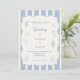 A hand drawn style wedding invitation with beach, coastal theme. A soft ivory and dusty blue striped colored background, with an ivory frame and dusty coastal blue elements. Personalize and add your names and the details.