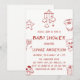The minimalist red line art design creates a modern yet playful look, perfect for a cozy at-home baby shower or casual celebration. The clean layout keeps the focus on your event details while adding sweet baby-themed illustrations around the card.